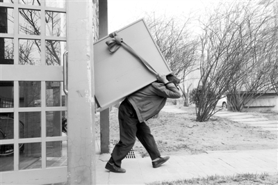 3月19日,庹师傅从北京五环外一栋居民楼里把衣柜背出来,长条绑带包着衣柜更容易着力,但衣柜还是把他的腰压得深弯下去。本报记者 吴凡 摄