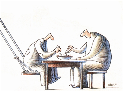 看似两者利益均沾,其实是不同待遇下的“平等”。漫画家无需语言,依仗形象的画面展现矛盾冲突,这样的构思让读者在一番琢磨后得到启迪或诠释,高!