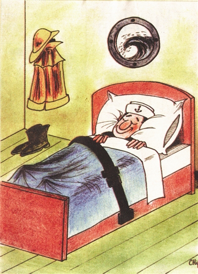 轮船乘风破浪行驶在浩瀚的大海上,船员们在颠簸中工作和生活,艰苦和寂寞提醒着船上每一个人,要格外重视安全!这位工友熟睡了——床上有安全带。