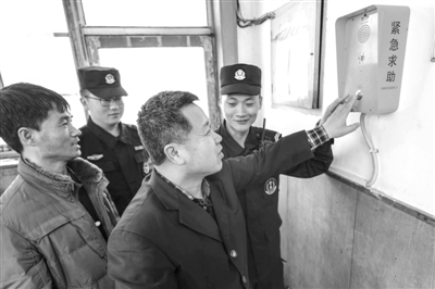 3月29日,河北永清县公安局巡警队员在为邮政局工作人员讲解安装在该局的一键式报警盒的使用方法。
