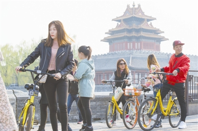 3月28日,北京故宫角楼附近,很多游客将共享单车列为热门景区的首选交通工具。本报记者 吴凡 摄