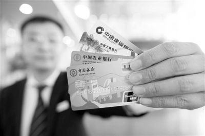 图为山西太原银行工作人员展示四大银行卡。