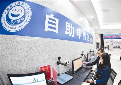 4月6日,在福建自贸区平潭片区综合服务大厅,工作人员(后)在引导企业人员使用自助系统办理业务。福建自贸试验区挂牌2年以来,围绕简政放权,为自贸区内创新、创业提供优质服务。新华社记者 宋为伟 摄
