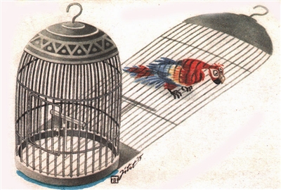“天高任鸟飞”道出自然规律与动物本能。如果禽类久居园囿,就会失去本色,甚至留恋牢笼。由此,读者联想起廖冰兄漫画《自嘲》。【印度尼西亚】吉泰特