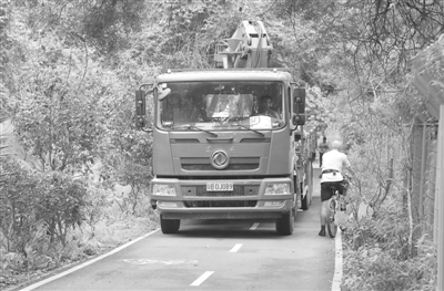 日前,广东深圳市龙岗区政协第九界别活动组根据群众普遍反映的梧桐山绿道管理混乱、安全隐患多等问题,组织委员到园山街道梧桐山绿道开展专项视察活动。委员们认为,梧桐山绿道是政府修建的很好的惠民项目,但由于管理不善,存在车辆在绿道随意进出行驶等问题,影响市民人身安全。图为一市民在深圳市龙岗区园山街道的梧桐山绿道西坑村路段骑行,被一辆大货车挤到绿道边上,现场险象环生。东方IC 供图