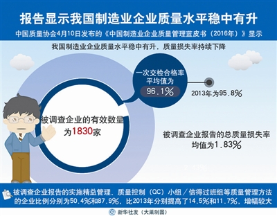 据新华社电 (记者王优玲)中国质量协会4月10日发布的《中国制造业企业质量管理蓝皮书(2016年)》显示,我国制造业企业质量水平稳中有升,质量损失率持续下降。