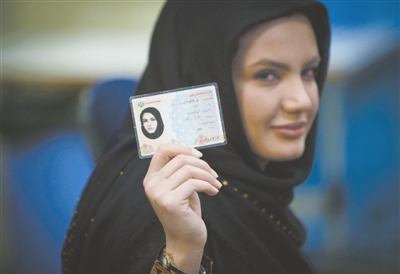 4月11日,在伊朗德黑兰,一名女子手持证件准备在内政部进行登记。