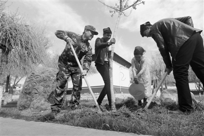 4月11日,新疆伊犁霍城县大西沟乡边防派出所民警谭龙(左一)和辖区群众植下“亲情树”。