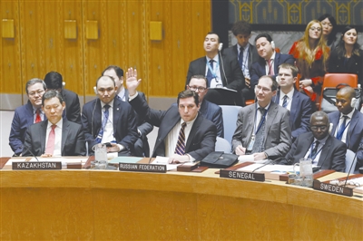 4月12日,在位于纽约的联合国总部,俄罗斯常驻联合国副代表萨夫龙科夫(前中)在安理会就英美法三国起草的叙利亚化学武器问题决议草案进行表决时投反对票。