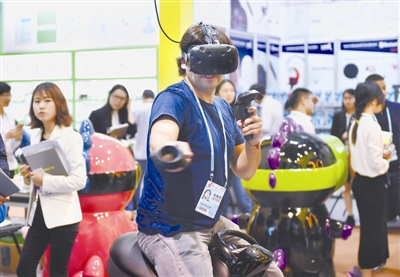 图为4月15日,一名采购商在第121届广交会上体验一款VR游戏。