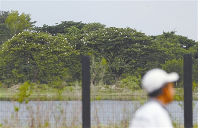 4月7日,马来西亚中车公司厂区外,有一个废弃的锡矿大坑,如今已被水填满,形成一个湖泊,湖中有多种鸟类栖息。