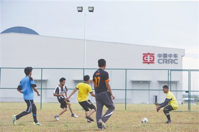 4月7日下午,在马来西亚中车公司厂区里,公司员工正在进行每周一次的户外体育足球比赛。他们几乎每天都有一项培训拓展训练。