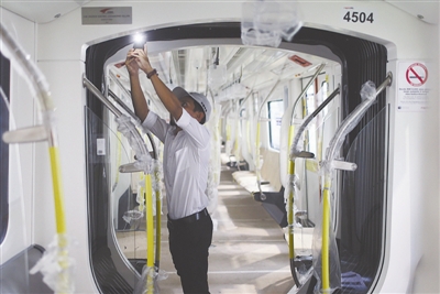 4月7日,在马来西亚中车公司生产基地,一位当地员工在一丝不苟地检查车体。中车株机公司力推海外公司员工本地化,目前本地用工已超80%。