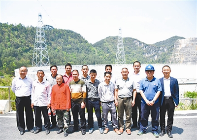 4月13日,中科院国家天文台500米口径球面射电望远镜工程副经理彭勃(右二)与相关人员一同和大窝凼原住村民合影。新华社记者 骆飞 摄