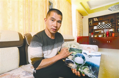 大窝凼移民杨天觉展示位于大窝凼的老家及“天眼”建设过程的图片。新华社发(卢志佳摄)