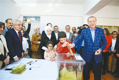 4月16日,在土耳其伊斯坦布尔,土耳其总统埃尔多安(右)在一处投票站投票。