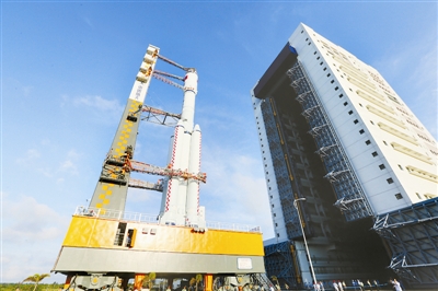 4日17日,长征七号遥二运载火箭与天舟一号货运飞船组合体在垂直转运中。