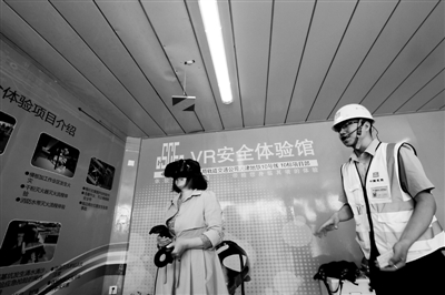 4月15日,中建六局轨道交通公司天津地铁10号线10标项目施工现场,VR安全体验馆、风险自动监控系统等信息技术一一亮相,实现了工地智慧化管理。图为来宾在VR安全体验馆体验安全施工。张道正 摄/中新社