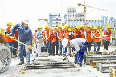 4月17日,武汉,汉口黄孝西路一在建项目工地,武汉市城管委组织相关专业的大学生前来实地参观学习。