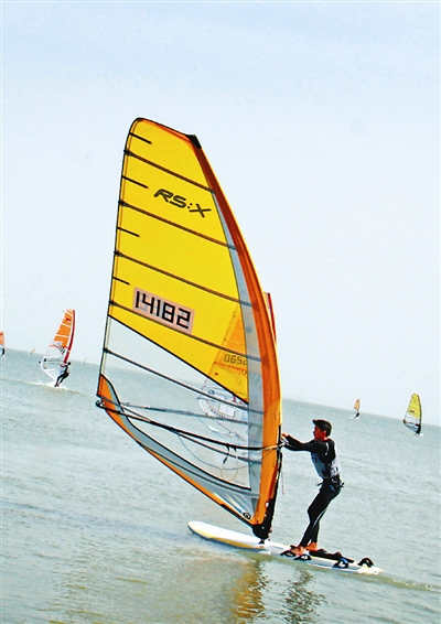 4月19日,中国青年帆船帆板精英赛暨全国OP帆船锦标赛在巢湖岸边围堰外围举行。图为选手在比赛中。张大岗 摄