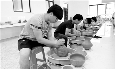 近年来,广西钦州市100多家坭兴陶厂家与钦州学院进行产教融合,协同培养“下得去、用得上、留得住”的高素质应用型“工匠”人才。图为该学院一、二年级学生在制作室练习。