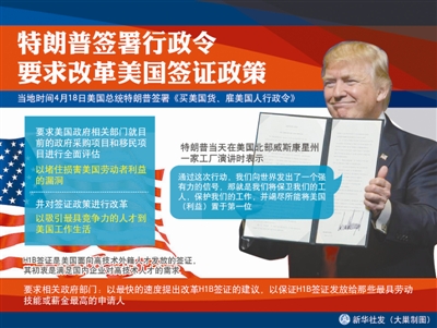 4月18日,美国总统特朗普签署名为“买美国货、雇美国人”的行政命令,其中要求国务院、司法部、劳工部以及国土安全部等部门对H-1B签证申请中存在的欺诈和滥用提出修改意见,确保该签证发放给那些符合条件的高技能、高收入外籍人才。特朗普说:“通过这一行动,我们向全世界发出强烈信号:我们将维护我们的工人,保护我们的工作,最终让美国处于第一的位置。”