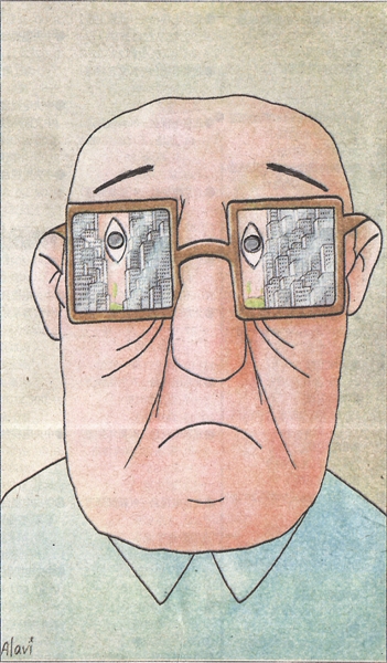 高楼大厦遮天蔽日,留给人们透气的空间实在有限。漫画家运用巧妙的比喻,夸张了眼镜、眼睛、楼距的窘迫,令人深思。