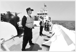 4月20日,巡航结束仪式上,中国海警3301舰的舰员在甲板上列队。 当日,为期三天的中越海警2017年第一次北部湾共同渔区海上联合检查结束。