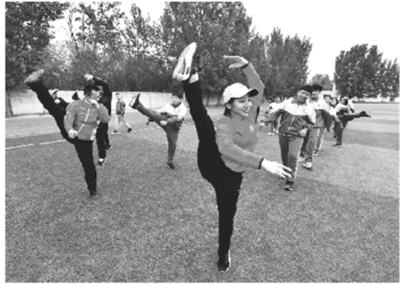 4月19日,奥运冠军邓琳琳(前)带领学生上体育公开课。