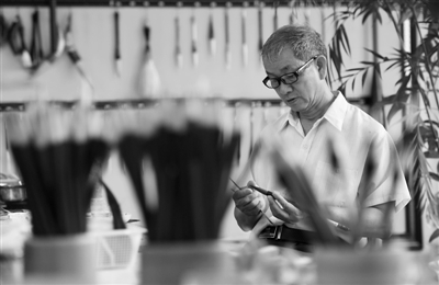 65岁的大罗村毛笔老工艺人罗儒供在修笔(4月21日摄)。