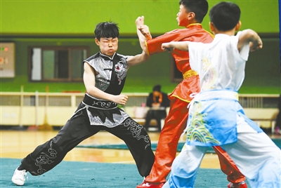 4月22日,北京市传统武术锦标赛在北京市石景山体育馆举行。本次比赛由北京市武术运动管理中心与石景山区体育局共同主办。来自北京市各区武术馆、校、俱乐部、拳种研究会等48支代表队882名运动员参加了本次比赛。图为选手在比赛中。本报记者 许之丰 摄