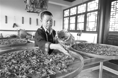 4月21日,黄尤新将采摘的茶青摊放在木制摊青架上。“摊青”是手工制茶的关键流程之一,目的是让茶青背面的白毫显露出来。