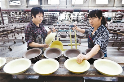 在淄博一家陶瓷公司生产车间,工人在为陶瓷制品施釉(4月13日摄)。