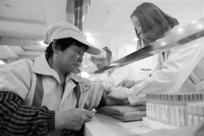 4月25日,环卫工人在合肥市周谷堆社区一家民营医院内进行免费体检。