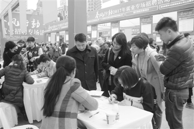 “春风行动”2017年就业专场招聘活动在重庆市江北区观音桥步行街举行,106家企业提供超过5000个岗位,吸引了众多市民前来咨询求职。在招聘会现场 ,上万人现场求职, 拥挤如春运,众多招聘摊位前都已爆棚。范永根 摄/视觉中国