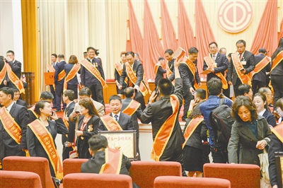 大会结束后,代表们纷纷起身走到台前合影留念。