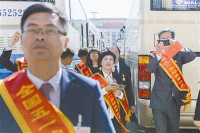 4月27日上午,受表彰代表乘车抵达人民大会堂,他们中的许多人都是第一次来到这里。当日,2017年庆祝“五一”国际劳动节暨全国五一劳动奖和全国工人先锋号表彰大会在北京人民大会堂举行。
