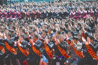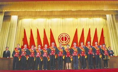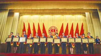 4月27日上午,全国五一劳动奖状获奖单位代表上台领奖后合影。