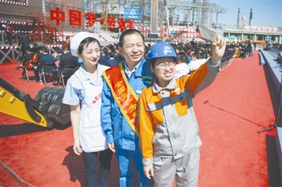 4月27日上午,全国五一劳动奖章获得者代表上台领奖后合影。