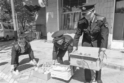 4月26日,河北省枣强县新华街“路长”和城管队员在清理商家违规占道经营的商品。