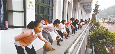 一个下雨天,凉亭坳第四届女篮队员在走廊练习运球。本报记者 罗筱晓摄