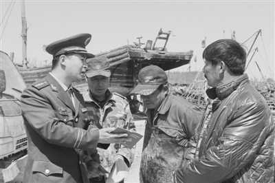 4月26日,河北省秦皇岛市西河南边防派出所民警向渔民讲解休渔期的有关规定。据悉,今年黄渤海休渔期由往年的6月1日开始提前到5月1日开始。