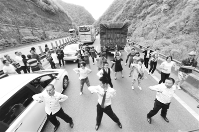 4月22日10时多,在距离西汉高速户菜出口东边,遭遇小范围的堵车,造成近百辆大小不一车辆滞留等待,长约半个多小时,一群从总部江苏学习返回四川的乘客们,为驱散堵车心慌、心烦,跳起舞蹈解闷,顿时,不少其它车辆乘客加入欢快舞蹈人群中。