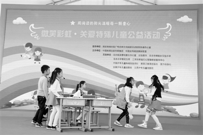 4月23日,微笑彩虹·关爱特殊儿童公益活动上,北京小学葵花五班学生表演的反映自闭症儿童的舞台剧《向日葵中队》打动了舞台下很多的观众。活动希望通过阅读这个平台让特殊儿童能在爱的彩虹下微笑成长,由国家新闻出版广电总局全民阅读活动组织协调办公室指导,中国新闻出版传媒集团、中国全民阅读媒体联盟主办。(王毅 摄)