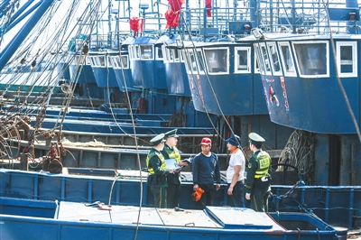 5月1日,大连边防支队桃园边防派出所民警在大连市金州区杏树国家级中心渔港内对回港的渔船进行登记。