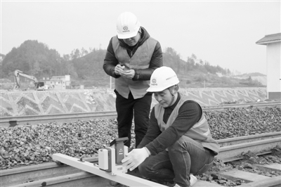 姚振宁(右)正在测量承导线高度。 张玄玄摄