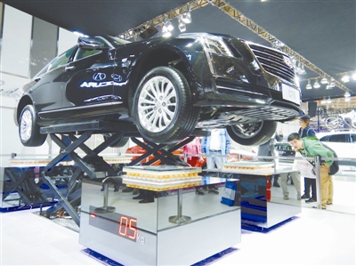 4月28日~5月2日,为期5天的第十届中国(南京)国际汽车博览会举行,70余个汽车品牌厂商携600余辆整车参展,引爆“五一”车市。图为南京国际博览中心车博会现场,一美系汽车品牌展台上演“鸡蛋碰汽车”,用1.6吨展车四轮落在4盒鸡蛋上,以展示其轻盈省油的新形象。