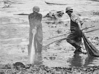 工人在泥水中清淤
