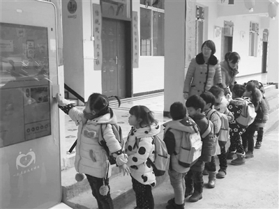 幼儿园小朋友放学时正在排队刷卡 。