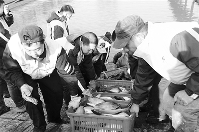 为丰富沿线职工餐桌,沈阳工务段建立农副业养殖基地,今年以来为28个职工小食堂提供猪肉2250公斤,鲜鱼560公斤。图为该段职工在搬运捕捞的河鱼。王锐 摄